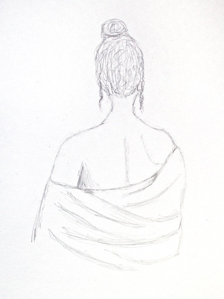 The Lady In Grey. It measures 19 cm x 28 cm and was painted on Saunders Waterford high white paper, 140 lb NOT. It was painted in watercolour without a preliminary sketch. But I did do a pencil sketch on a separate sheet of paper first just to get a feel for the shapes and lines. Here’s my pencil sketch: