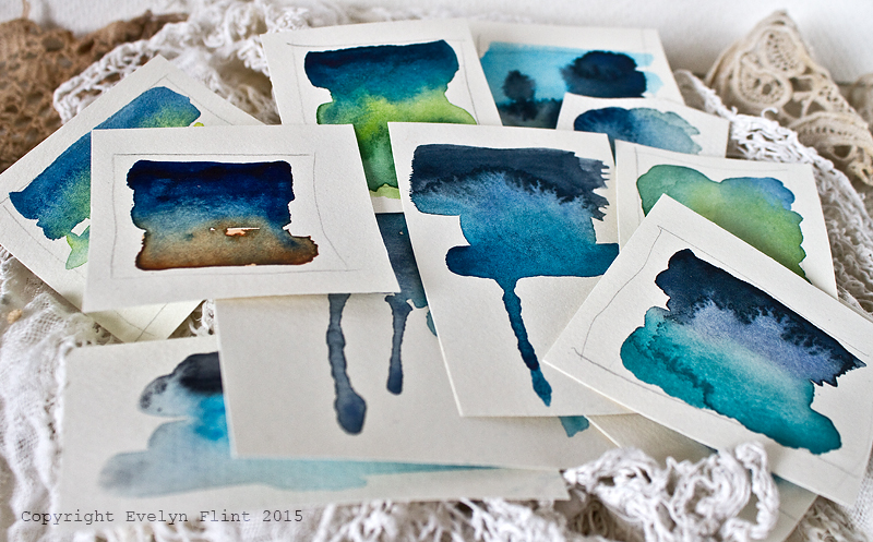 The watercolour samples above are among the very earliest watercolour experiments I ever did! I still have them – they are now glued into an old sketchbook with some other early colour and art experiments. Beautiful blue shades – Prussian Blue, Indigo, Cerulean Blue along with Phthalo Turquoise, Lemon Yellow, Payne’s Grey, Sap Green and Burnt Umber – all by Winsor & Newton. I treasure these beautiful little pieces of my art journey.
