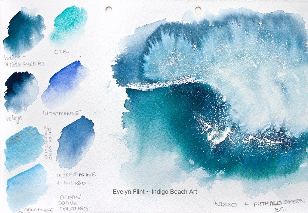 For this wave practice I used Winsor & Newton’s Indigo with Daniel Smith’s Phthalo Green Blue Shade – they also mix together to make a stunning turquoise shade. Again I considered where I would need to leave white areas before I began. I also splattered some masking fluid for some sea spray before painting. Notice the watermarks at the top of the wave; I created these deliberately to add a sense of movement, a feeling of the wind blowing across the top of the wave. I splattered a little Titanium White for some extra sea spray at the end. Notice too that in both of the waves I have added some very dilute Indigo into the white area to add some volume and movement to the waves.