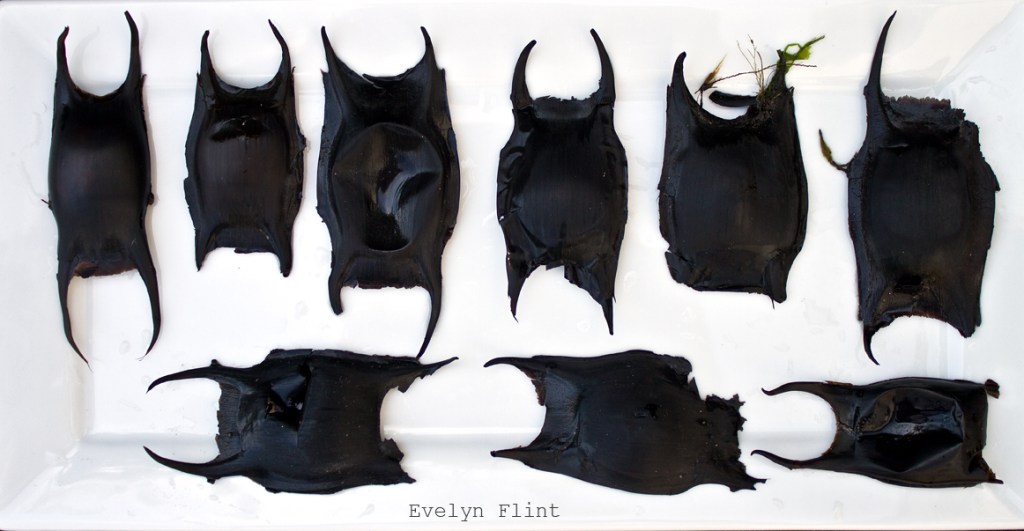 The expression “Mermaid’s Purse” is just lovely! They are actually eggcases. The darker, larger ones above with the horns are skate and ray eggcases, and below them are the smaller green-gold shark eggcases. Exactly which varieties I’ve found I can’t be sure – they can be tricky to identify. But what I do know is that I want to paint them!