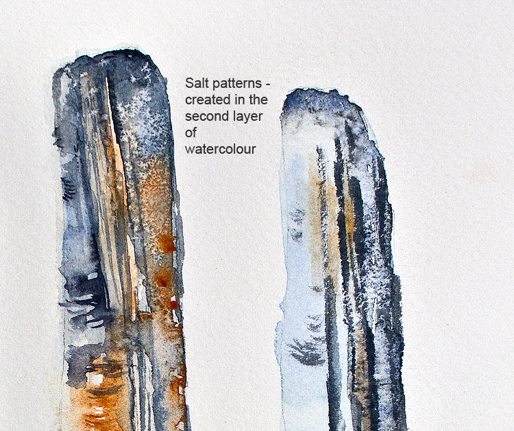 The watercolour sketches above were also done by building up several layers of watercolour paint. I used mostly blue-grey colours and tones, with small areas of earth colours. To get the shapes of the razor shells above I simply put them on my watercolour paper and very lightly drew round them with a pencil. I also used salt to create some texture in these sketches which you can see better below…