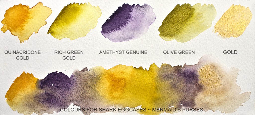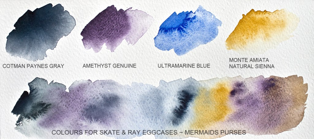 At this stage, these are the colours I plan to use to paint my Mermaid’s Purses. Of course, I always reserve the right to change my mind… !! A little time spent working out what colours to use before painting is always time well spent – less chance of unfortunate colour “surprises”. My Mermaid’s Purses watercolour sketches will go in another post.