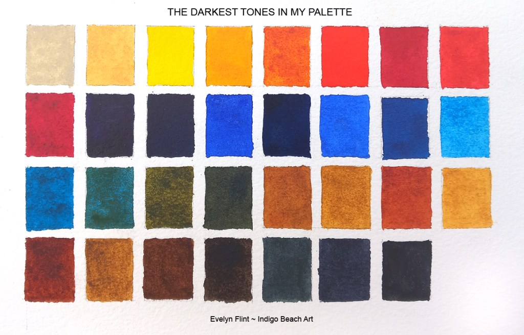 The darkest tones above, value 8 – 10, like Indigo, Sepia, Jane’s Grey, Lunar Black, Prussian Blue, Ultramarine Blue, Flint Grey, Burnt Umber, Transparent Red Oxide, Undersea Green etc., are going to achieve the widest range of values from the very dark to very pale. They are extremely useful to the watercolourist.