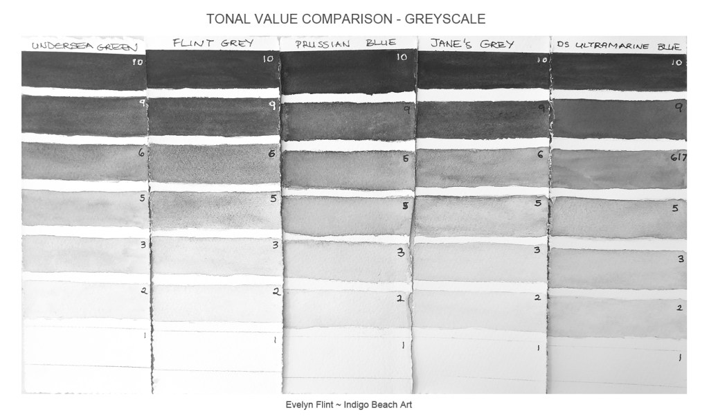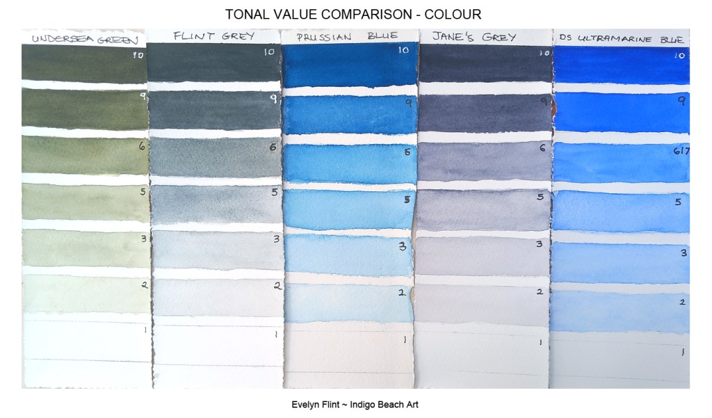 When you compare the different tones of each colour in the greyscale image above, notice how the tones are identical for each colour. I will keep these colour tone samples for future reference and I will probably create more for other colours in my palette. This has been a really useful exercise and I feel I already have a much better understanding of tonal value. In the colour comparison chart, when I compare the Undersea Green values 6 and 9 with the same Prussian Blue values, I would have said that the Undersea Green was darker; but when comparing them on the Greyscale chart, I can see that the tones are, in fact, identical!