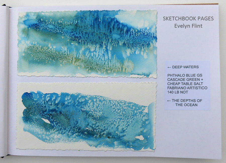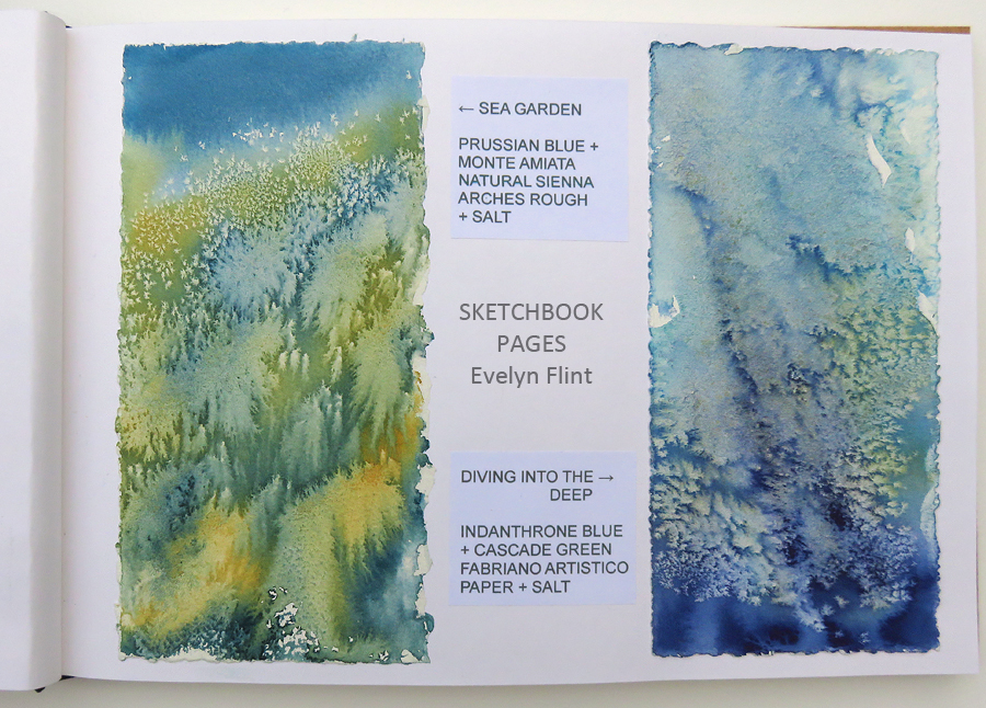 The four watercolour experiments on the two pages above were painted some time ago now, but they’ve only just found a home in my current sketchbook. I’ve put the necessary details next to the images for my future reference. I used very cheap ordinary table salt for these. You don’t need to buy fancy, expensive salt to get good results. I have done a post about my observations on creating salt patterns – you can read it HERE. The sketchbook I have put my art into here is an Artway Enviro hardbound sketchbook, A4 landscape style.