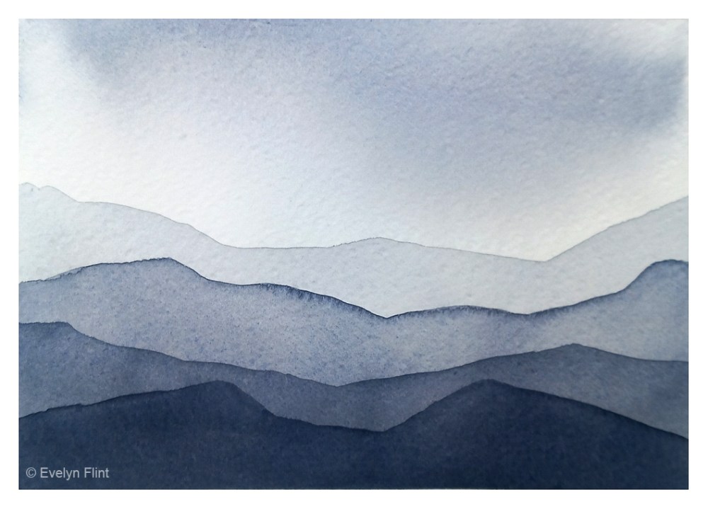 The layers exercise above was painted on Fabriano Artistico 140 lb rough paper. Colour used was Payne’s Grey. I painted the sky area first; then I worked on each layer of mountains, starting with the lightest (at the back) to the darkest at the front. It’s so important to let each layer dry completely before starting a new one. This was also a very simple lesson in aerial perspective – light cool tones recede into the background and warmer darker tones come forward. I will do another one of these exercises with different colours to illustrate this more fully.