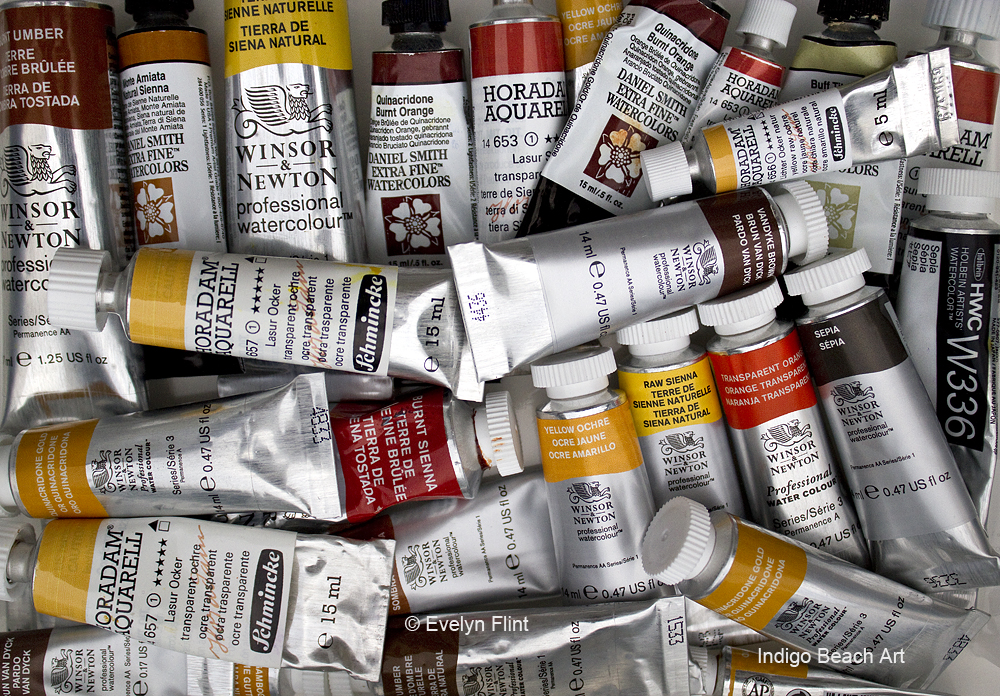 - Look at them. Are there colours you really don’t like and/or wont ever use? Then GET RID OF THEM – you don’t need them! It’s very liberating! Give them to an artist friend who does like them and will use them, that way they’re not being wasted. Don’t paint with colours you don’t like, just because a well known/favourite artist uses them. Find alternative colours you do like, make your own choices – there’s an enormous variety to choose from out there!