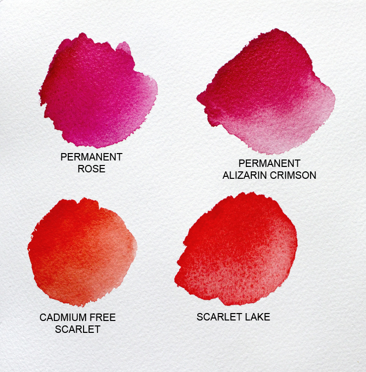Cadmium Free Scarlet and Scarlet Lake are warm reds, Permanent Rose and Permanent Alizarin Crimson are cool reds.