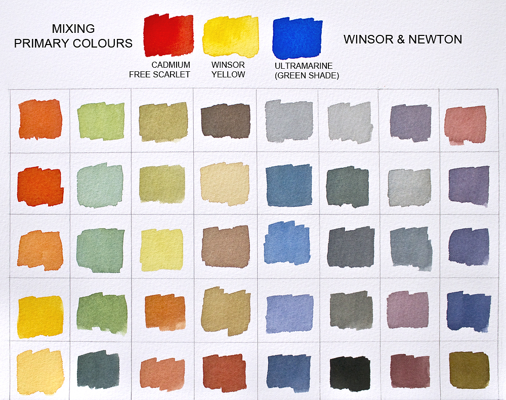 Above is just one example showing some of the colours you can create (including black!) by mixing a red, yellow and blue. The different combinations of red, yellow and blue you can use for a chart like this are almost infinite, due to the enormous choice of watercolours available today.