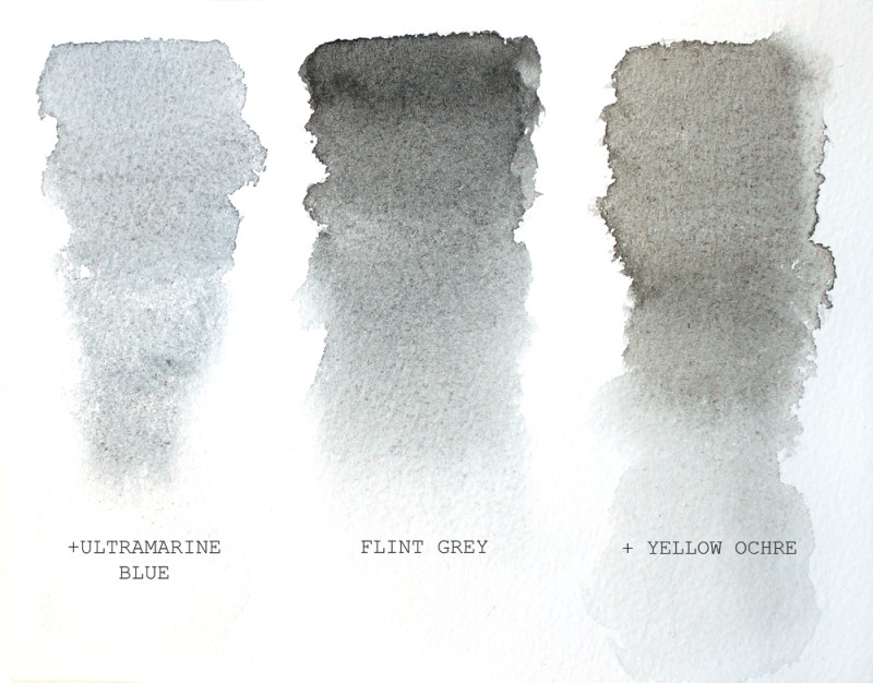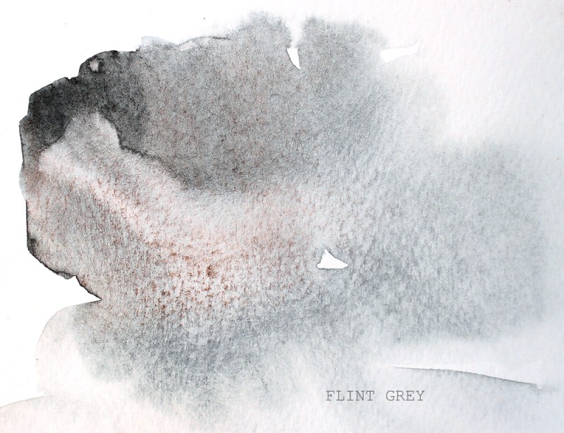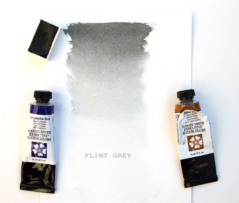 Flint Grey is a mix of Daniel Smith’s Ultramarine Blue and Yellow Ochre. Both of these watercolour shades are transparent, granulating and have an excellent lightfastness rating. These colours, mixed in the correct proportions, make a soft, stunningly beautiful and totally neutral grey that is just what I was looking for.