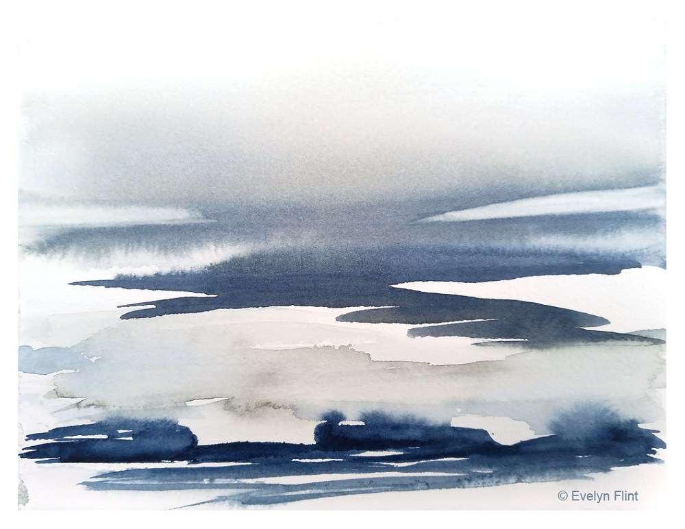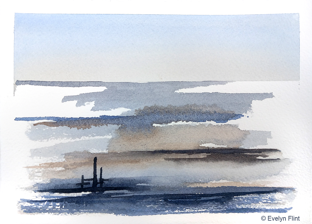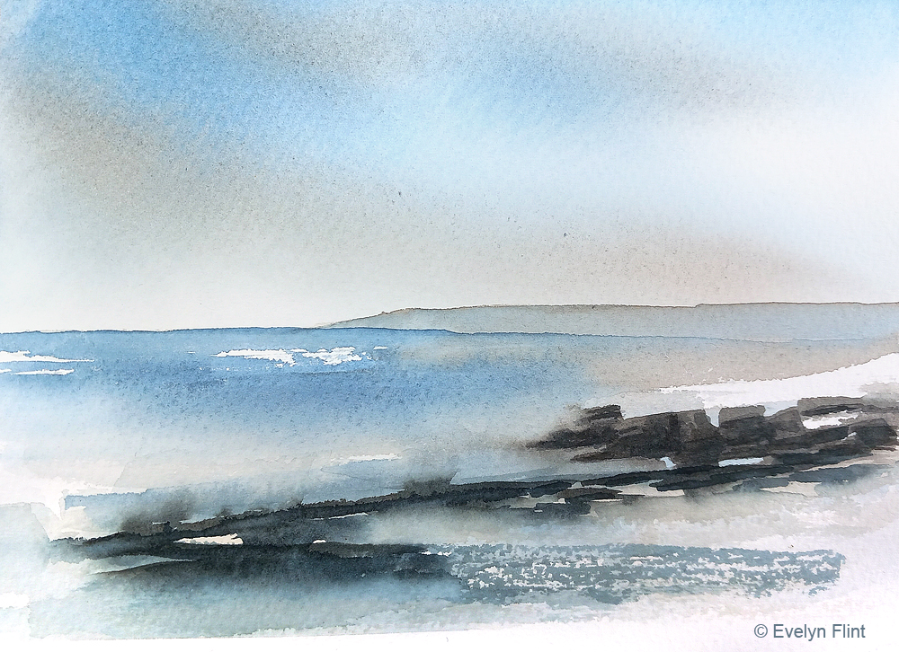 A simple loose watercolour seascape, although it started out as sky practice for Maria Wigge’s Diving Deeper With Watercolors course. Colours used were Phthalo Blue Red Shade, Hansa Yellow Medium, Jane’s Grey and Buff Titanium. I created deliberate watermarks to depict the waves at the shore line; it’s a tricky, slightly unpredictable technique but one I love to do.